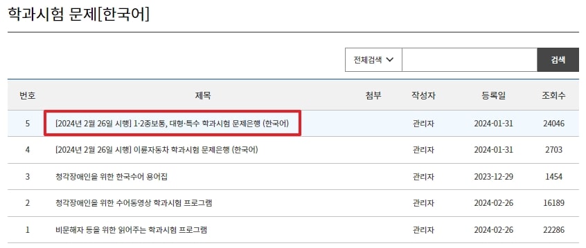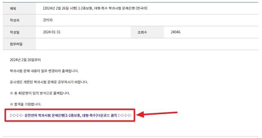 게시판 제일 상단 ‘1·2종보통, 대형·특수 학과시험 문제은행(한국어)’ 게시글을 클릭합니다.